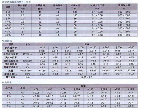 鋼絲由PVC過塑成框架結(jié)構(gòu)的軟式透水管。它們具有通過整體的周身全方位過濾并快速有效排除地下水,滲透率高,排水量大,取代傳統(tǒng)的聚氯乙烯打孔管滲水。使用方便,功效高等優(yōu)點。